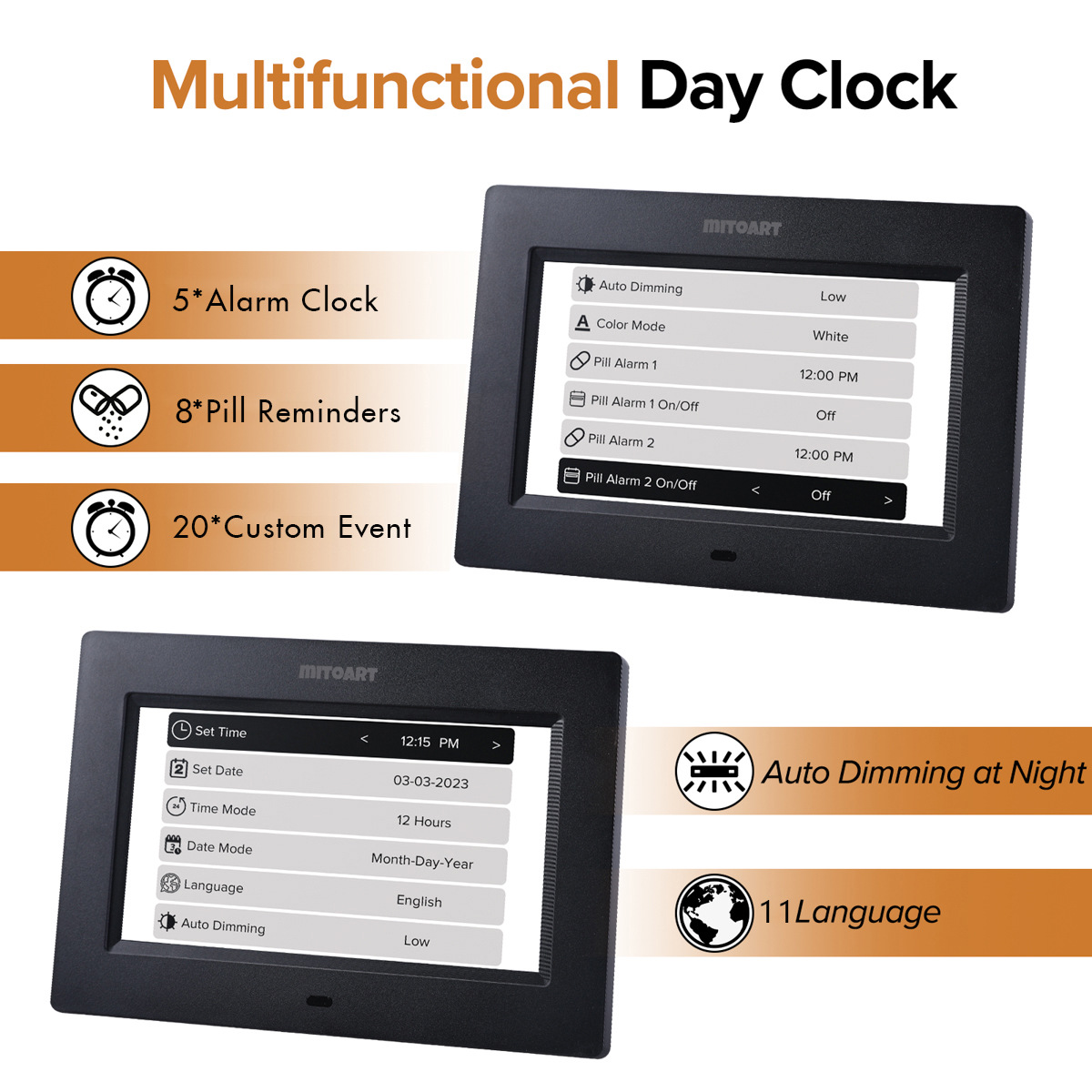 Introducing the latest in senior-friendly technology: a large digital clock designed specifically for seniors. With its impressive 7-inch screen, high contrast display, and bold letters, this clock ensures that all times, months, dates, and days of the week are clearly visible. The clock offers 3 display modes - Elderly Clock, Wall Clock, and Colorful Clock - providing options for personalized preferences. Rest assured, elderly individuals will have no trouble reading the time and date at a glance with this innovative and user-friendly device.